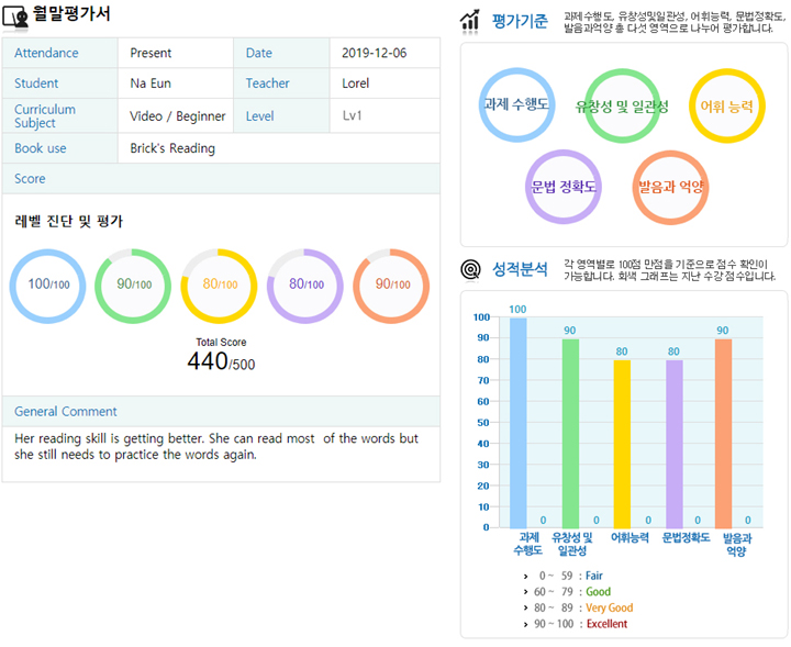 레벨평가의 결과를 근거로 교재나 수업 수준을 변경할 수 있습니다.